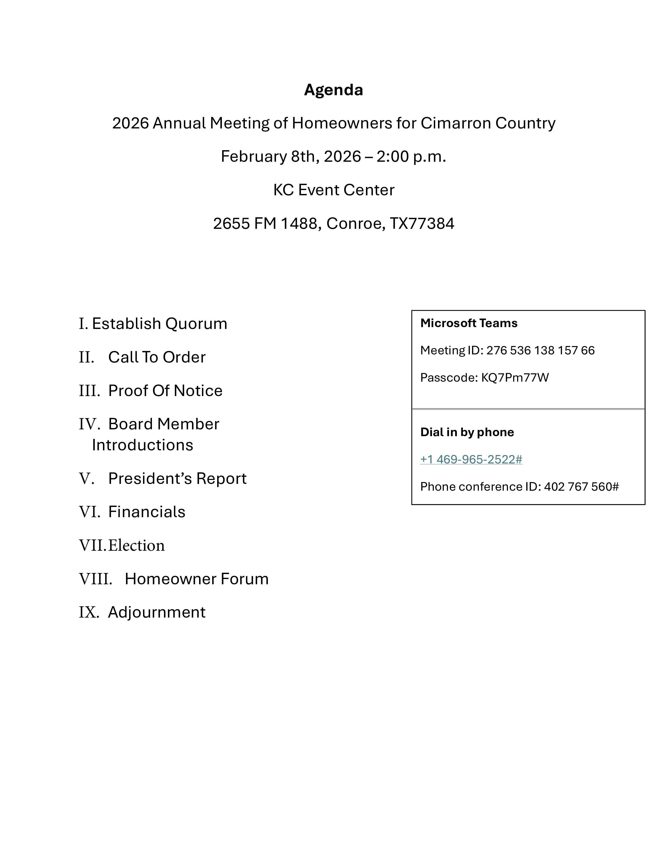 Meetings are held via Microsoft Teams. If you would like to join the meeting by phone or video conferencing, please contact our IMC Property Manager,